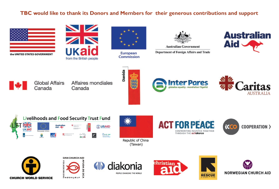 Approximately 95 percent of its funding came from government donors such as  US, UK & Australia. Although most of TBC’s funds are now institutional, it still continues to receive funds from individuals, private foundations and organisations and churches. These contributions are particularly encouraging and uplifting for our staff and members. To make a donation, please visit the Donation page.