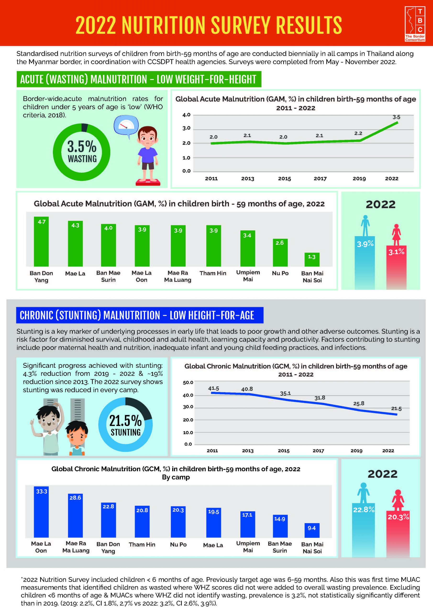 TBC’s 2022 Annual Nutrition Survey Infographic is now available. Covering details of nutrition standards in all nine refugee camps along the Thai-Myanmar border, the infographic is available in English, Burmese, & Karen.