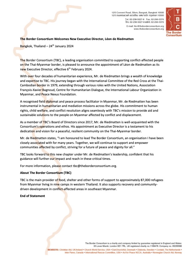 The Border Consortium (TBC), a leading organisation committed to supporting conflict-affected people on the Thai-Myanmar border, is pleased to announce the appointment of Léon de Riedmatten as its new Executive Director, effective 6th February 2024. Please see the full press release attached here.