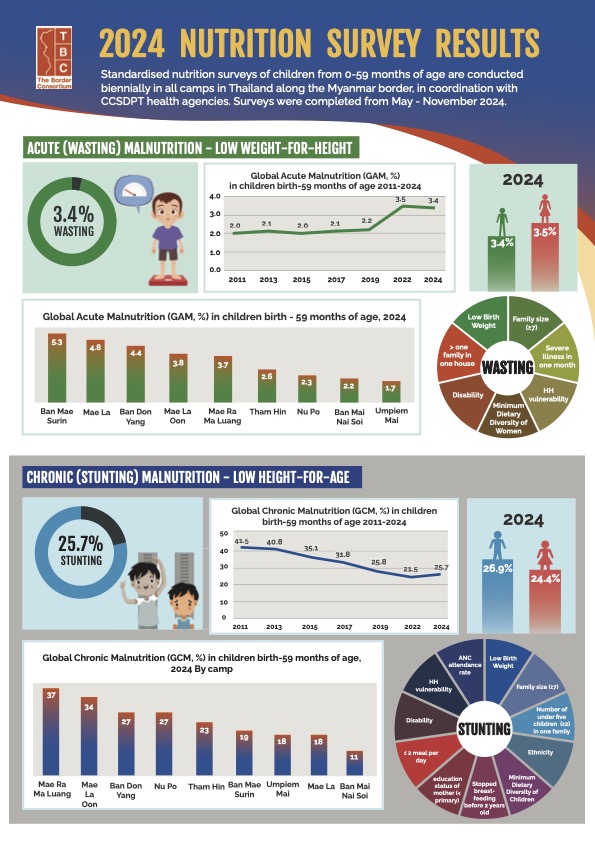 TBC's 2022 Annual Nutrition Survey Infographic is now available. Covering details of nutrition standards in all nine refugee camps along the Thai-Myanmar border, the infographic is available in English, Burmese, & Karen.